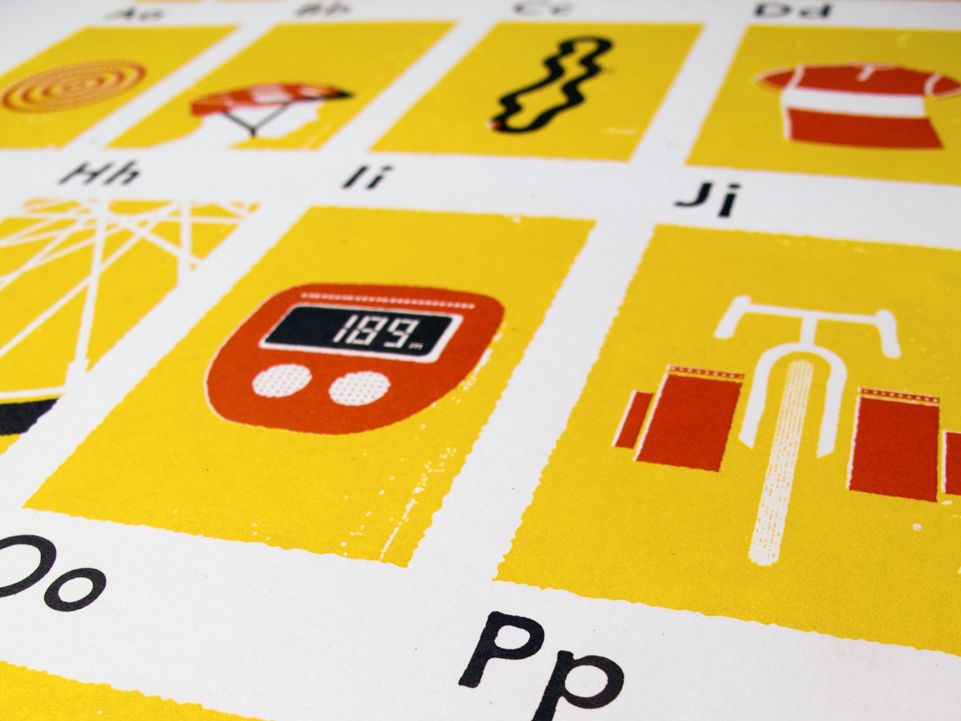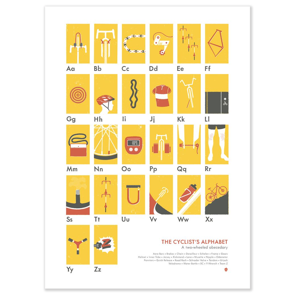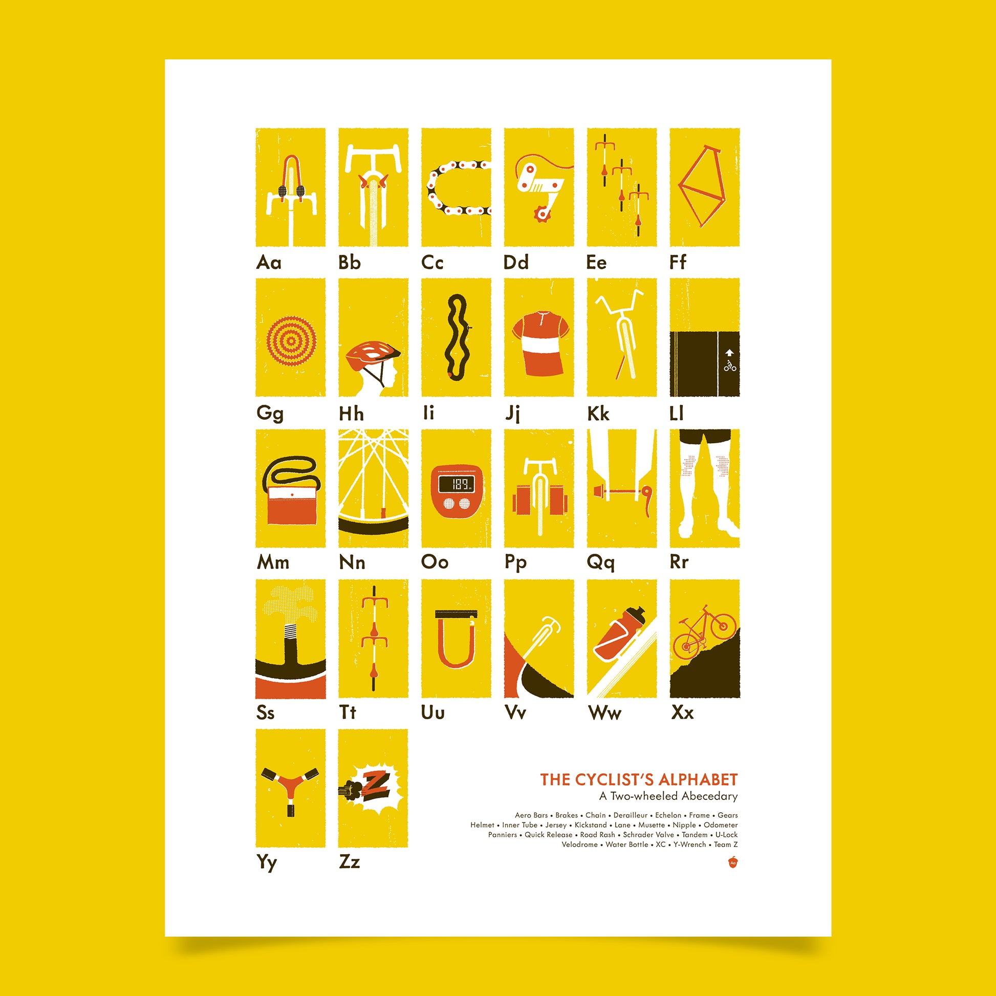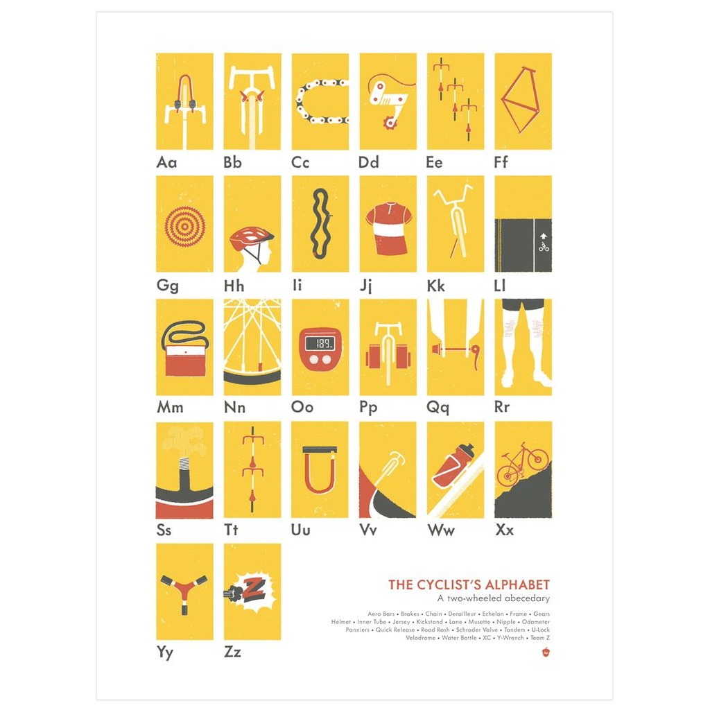 From aero bars to Team Zed, the Cyclist's Alphabet is now available for your walls. Two-wheeled enthusiasts from everywhere can appreciate both the technology and history behind our favorite mode of transportation with unique illustrations of all 26 letters.